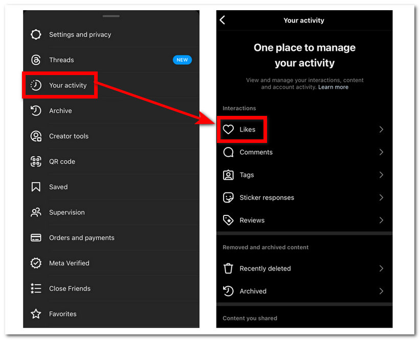 Go to Your Activity, locate the Likes tab, and click on it. (Learn how to use likes on Instagram here.)