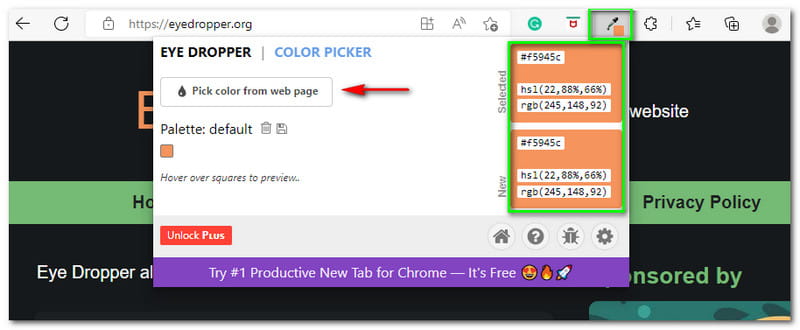 Uzantıda Göz Damlalığı'nı göreceksiniz. Uzantı simgesine tıklayın, Göz Damlalığı, ve iki seçeneği göreceksiniz; Göz Damlalığı ve Renk seçici. Bir kez seçtiğinizde Göz Damlalığı, göreceksin Web Sayfasından Renk Seç buton. Bundan sonra, tıklayın ve ekranınızda bir renk seçmeye başlayın. O zaman, tüm göreceksin Seçildi ve Yeni Renk Kodları.