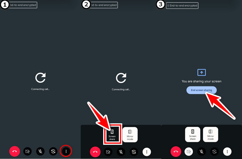 Telefonunuzda Google Meet'inizi açın, ardından bilgisayar ekranınızı Google Meet'te paylaşın. Alttaki üç noktaya tıklayarak yansıtılmış telefon ekranı seçeneğini seçin. Ekran paylaşımı seçeneklerinde, yansıtılan telefon ekranınızı Aiseesoft Phone Mirror'a görüntüleyen pencereyi veya uygulamayı seçin.
