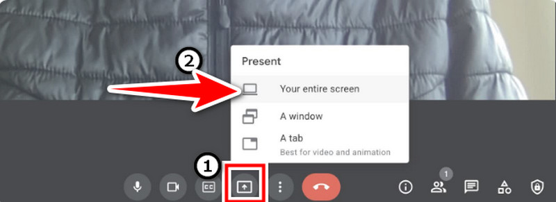 Dizüstü bilgisayarınızda Google Meet'te bir toplantıya katılın veya yeni bir toplantı başlatın. Toplantıya girdikten sonra ekranın alt kısmında bulunan araç çubuğunu bulun.
