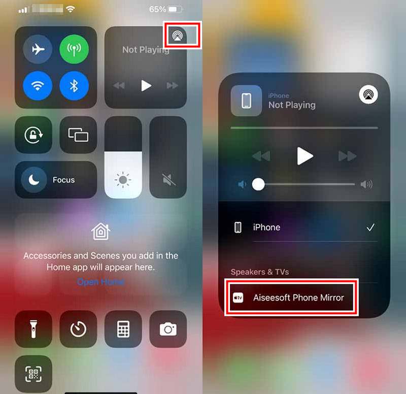 Kontrol Merkezi'ne gidin ve Ekran Aynalama simgesine dokunarak açılır listeden Aiseesoft Telefon Aynası'nı seçin. iPhone'unuzun ve PC'nizin tam olarak bağlanması biraz zaman alacaktır.