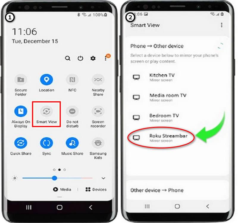 Android cihazda ekranı aşağı kaydırarak Hızlı Ayarlar panelini açın. Cast veya Screen Mirroring seçeneğini bulup basın veya bir Samsung cihazı kullanıyorsanız bağlantıyı başlatmak için Smart View'u seçin. Kullanılabilir cihazlar listesinden Roku TV'nizi seçin.