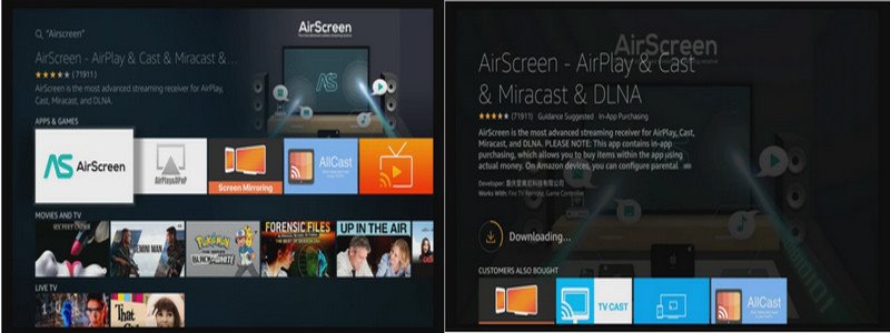Başlangıçta FireTV'ye erişin ve arama çubuğunu kullanın. Daha sonra AirScreen'i aramanız gerekir. Uygulama AirScreen'i bulun ve yükleyin. Yüklendikten sonra eşleştirme prosedürünü başlatmak için uygulamayı başlatın.