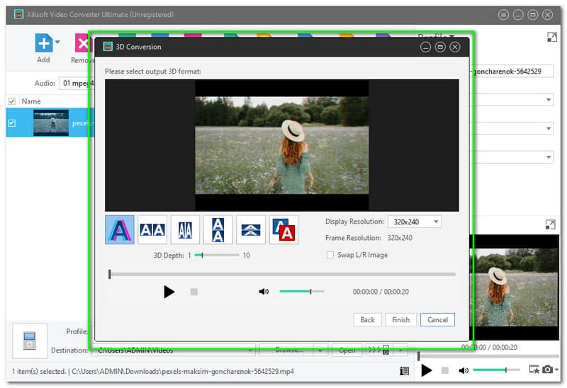 Xilisoft Video Converter Ultimate lets you convert your 2D movies to 3D movies and convert 3D movies from one format to another file format. You have to add your files and click the 3D Conversion above the software panel. Then, a new window tab will appear. You have an option to select if you want 2D to 3D or 3D to 3D. After that, you can now adjust the display resolution from 320x240 up to 720x480. If you are satisfied, you can now click the Finish button.