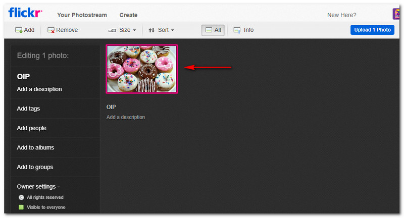 此外,如果您愿意,Flickr 可以为您的图像添加描述、标签、人物、相册和组。单击信息按钮时,您将看到有关原始图像的信息,包括其大小。