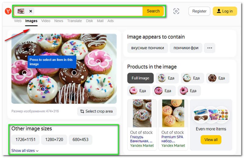此外,Yandex 反向图像搜索可让您在从计算机上传图像后对其进行裁剪。此外,它将为您提供从小到大的所有其他图像尺寸。它还可以向您显示图像上所有可能的连接。此外,您还可以搜索 视频、新闻、翻译、磁盘、邮件、广告、 和 网络.