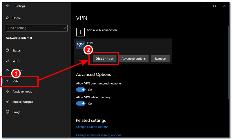 在“网络和 Internet”设置下,找到 VPN 部分。在那里,您可以找到设备正在使用的已连接 VPN。只需点击 断开 按钮继续。
