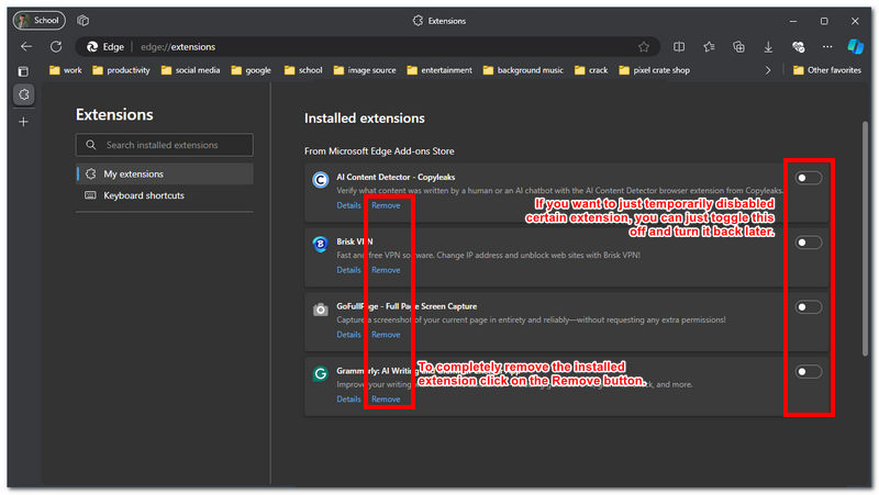 進入「已安裝的擴充功能」頁面後,您可以選擇完全刪除擴充功能或暫時停用它。