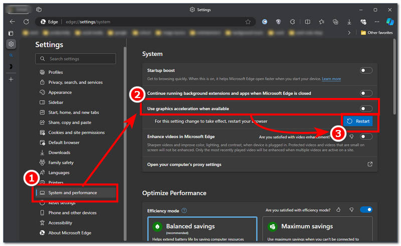 切換 可用時使用圖形加速 關閉功能並點擊其下方的重新啟動按鈕以儲存瀏覽器設定中的變更。