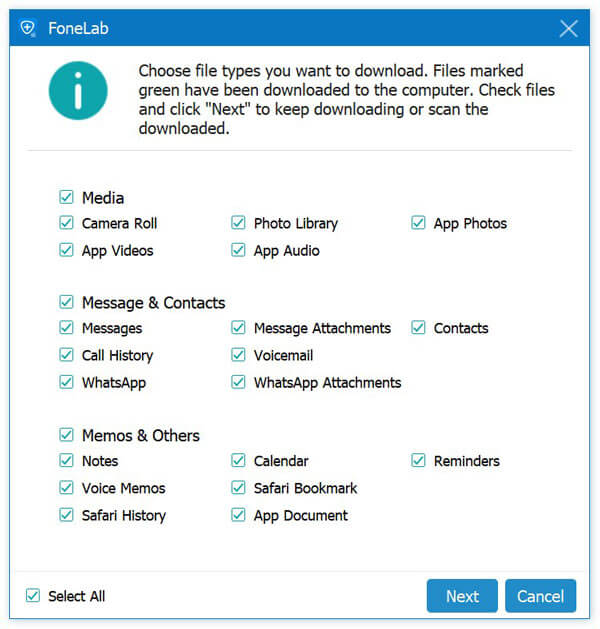 彈出視窗將顯示備份到 iCloud 的所有資料類型。選取要恢復的項目旁的複選框,然後按一下 下一個。然後軟體將開始掃描您的 iCloud 備份檔案。
